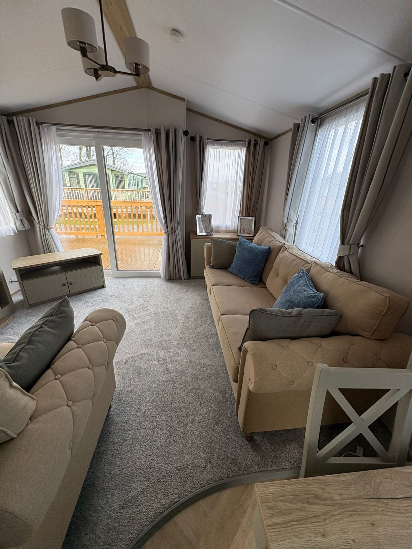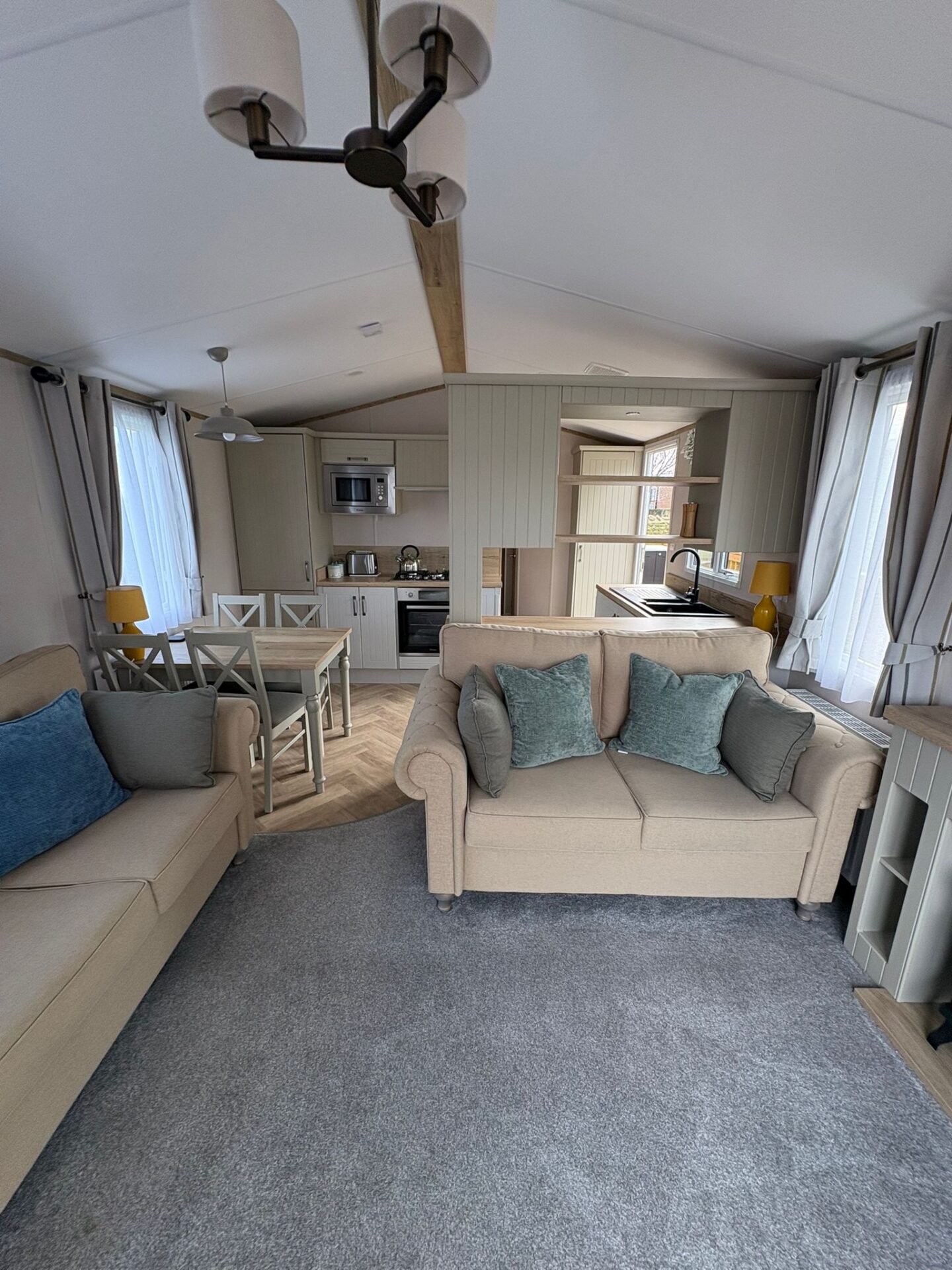 The Debonair interior is an epitome of country home living. The lounge has freestanding 2 and 3 seater settees with homely fabrics and contrasting stag and bolster cushions. The living room also features a log-burner style electric fire in a traditional mantelpiece setting.