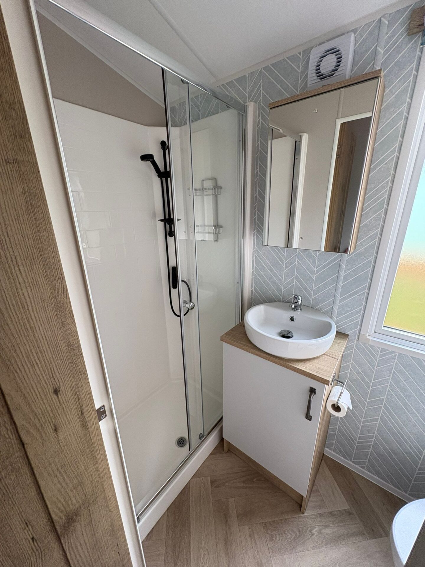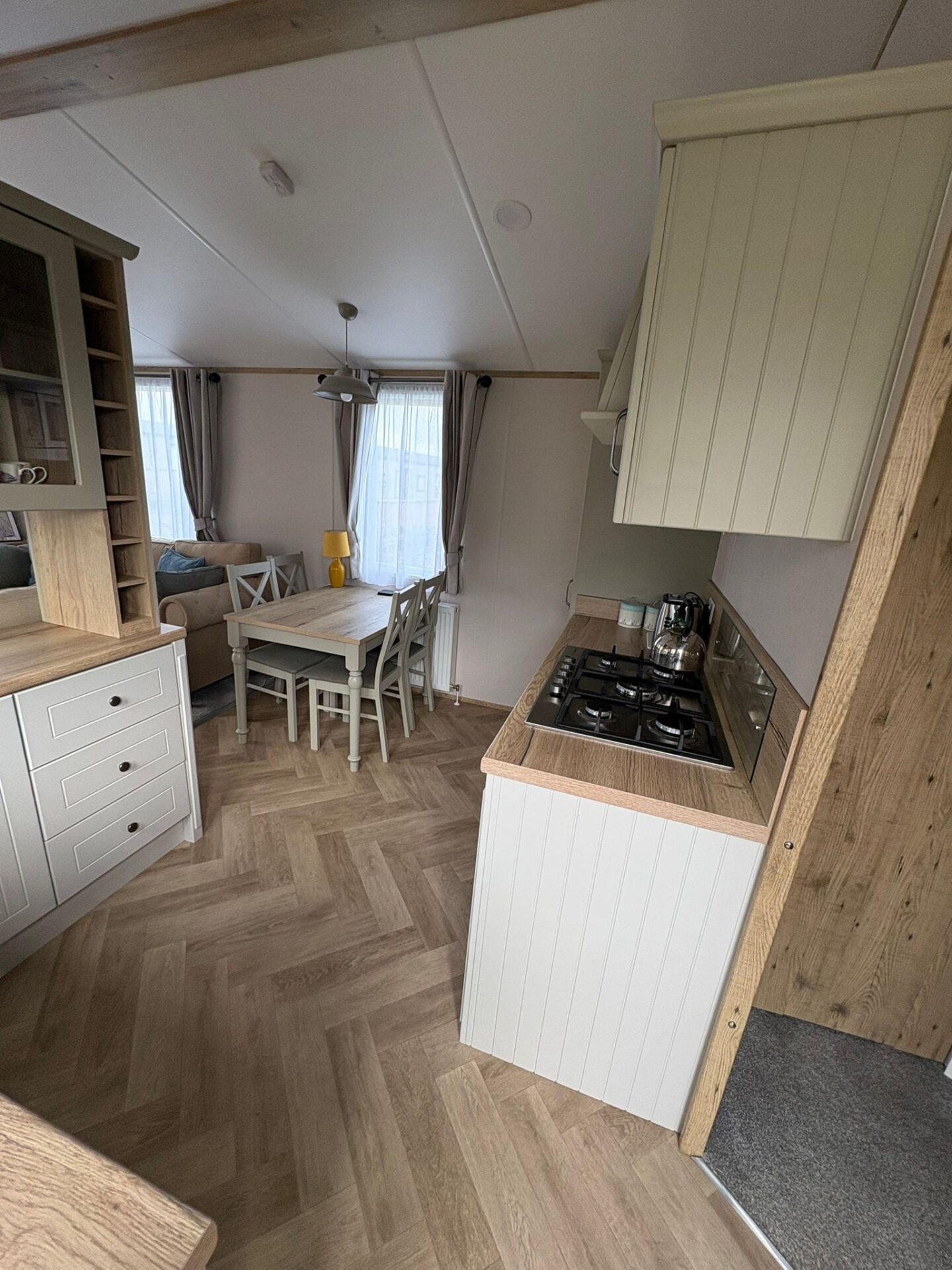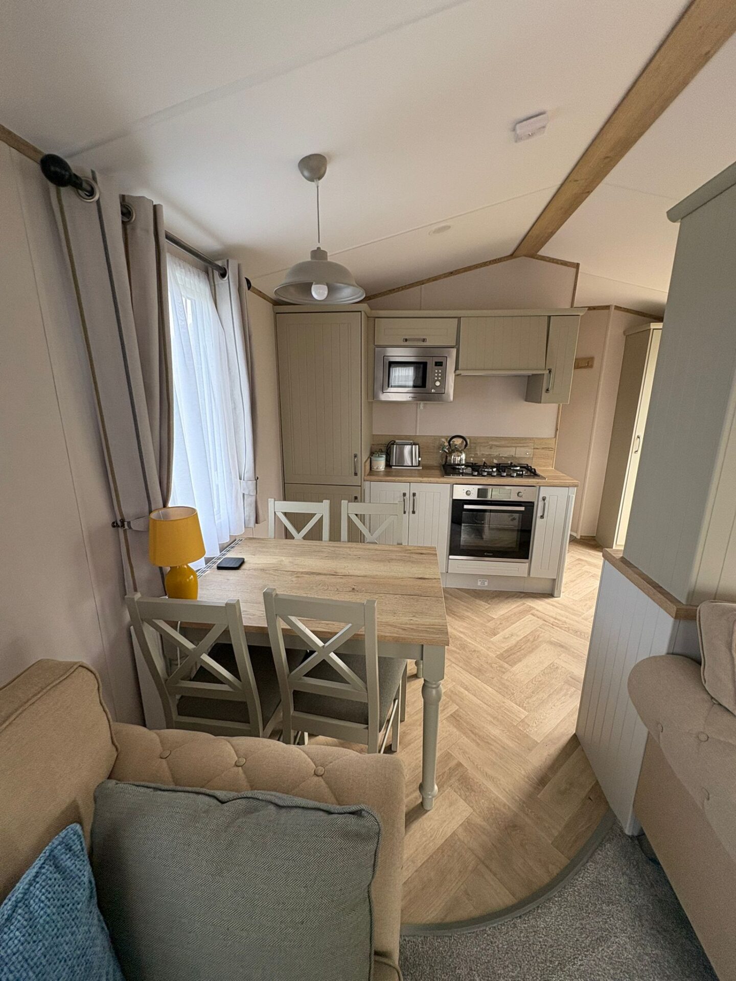 The Debonair has a fully fitted farmhouse-style kitchen benefiting from an integrated oven and 5 ring gas hob, electric cooker hood and integrated fridge freezer. The kitchen units are a mixture of standard and glass fronted doors for an added touch of elegance.