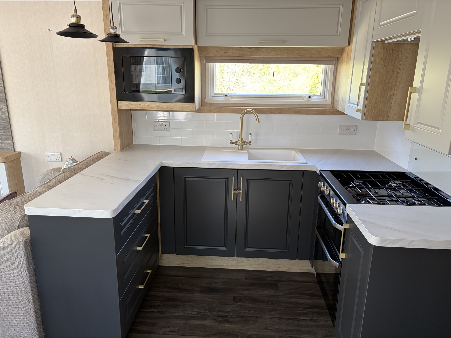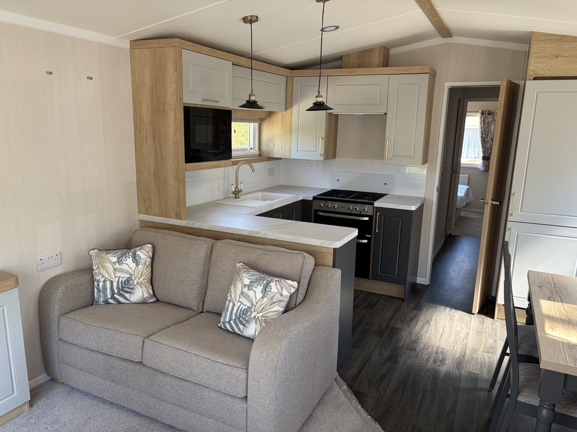 Inside, you’ll find a spacious lounge with free-standing furniture, creating a relaxed and homely feel. The fully fitted kitchen comes complete with an integrated fridge freezer and microwave, making it as practical as it is stylish. The master bedroom benefits from its own en-suite, adding an extra touch of convenience and luxury.