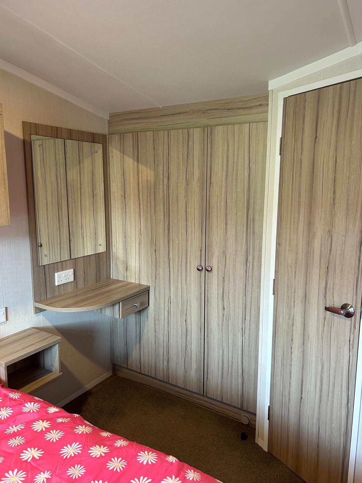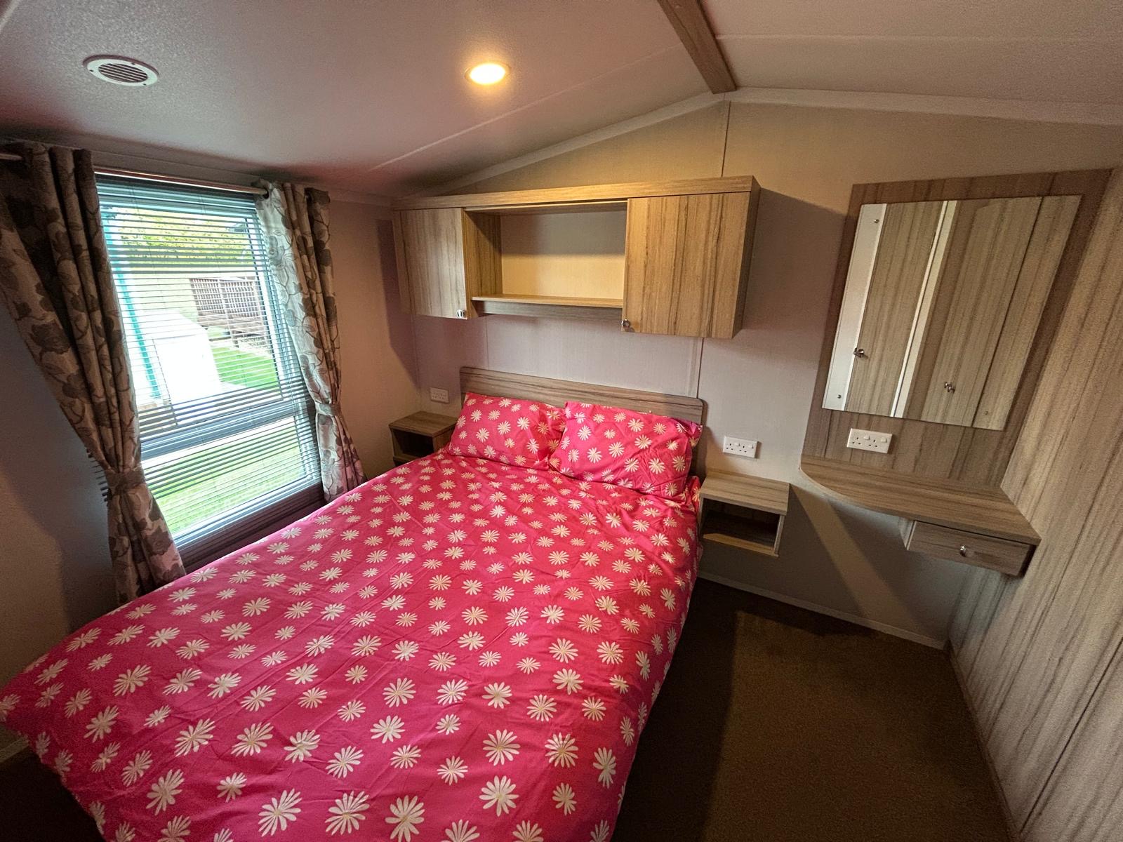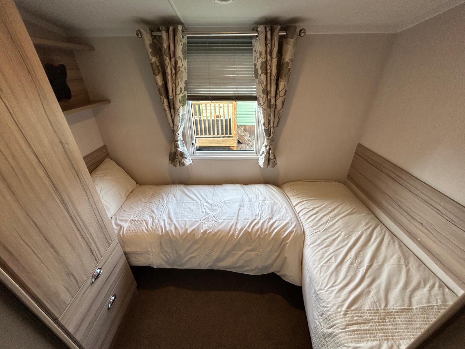 Situated at the top of the park on one of the quietest areas is this pre-loved Swift Burgundy holiday home, spacious corner plot and sunny location. 2 bedroom model with good sized lounge with pull our sofa bed, open plan lounge/dining/kitchen. Through hallway is the 2nd bedroom with two single beds, head to foot. Across is the house shower room. AT the back is the master bedroom with good storage and an en-suite with w/c and sink. Outside is a large decked area to the front and side which enhances the sunny position.